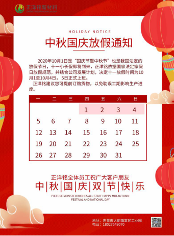 2020年10月1日是“国庆节暨中秋节”也是我国法定的放假节日,十一小长假即将到来,正洋铭依据国家法定家假日放假规范,并结合公司发展计划,决定十一放假时间为10月1至10月4日, 5日正式上班。