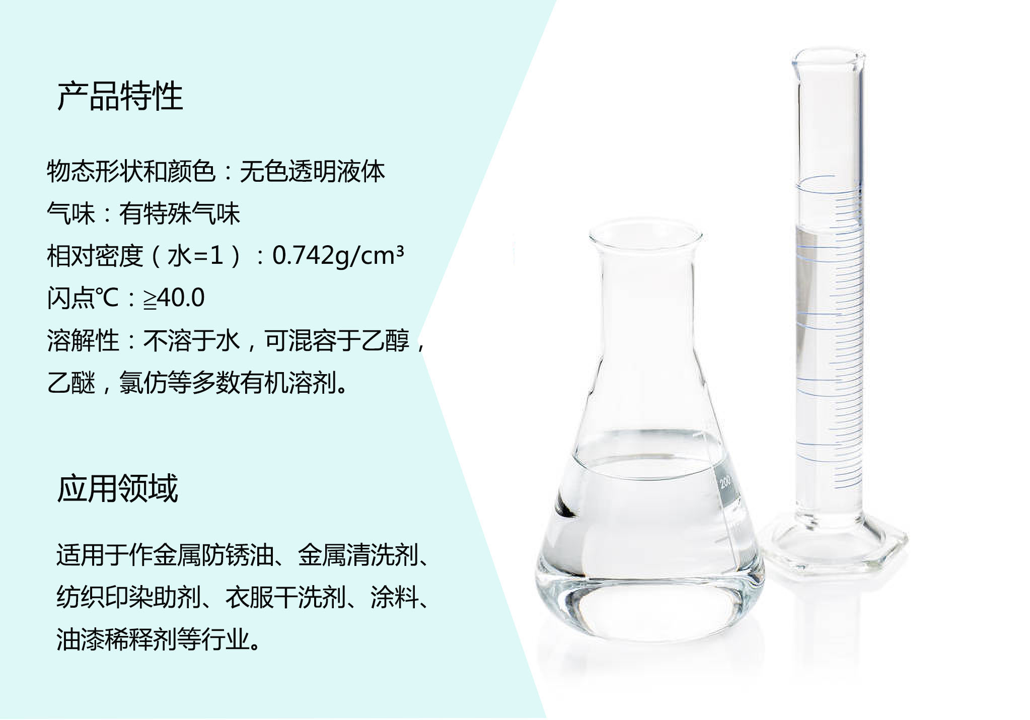 适用于作金属防锈油、金属清洗剂、纺织印染助剂、衣服干洗剂、涂料、油漆稀释剂等行业。
