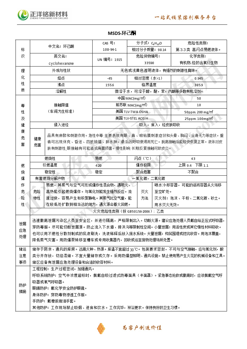 环己酮储存于阴凉、通风仓间内。远离火种、热源。仓内温度不宜超过30℃。防止阳光直射。保持容器密封。应与氧化剂分开存放。仓间内的照明、通风等设施应采用防爆型,开关设在仓外。配备相应品种和数量的消防器材。桶装堆垛不可过大,应留墙距、顶距、柱距及必要的防火检查走道。罐储时要有防火防爆技术措施。禁止使用易产生火花的机械设备和工具。灌装时应注意流速(不超过3m/s),且有接地装置,防止静电积聚。搬运时要轻装轻卸,防止包装及容器损坏。